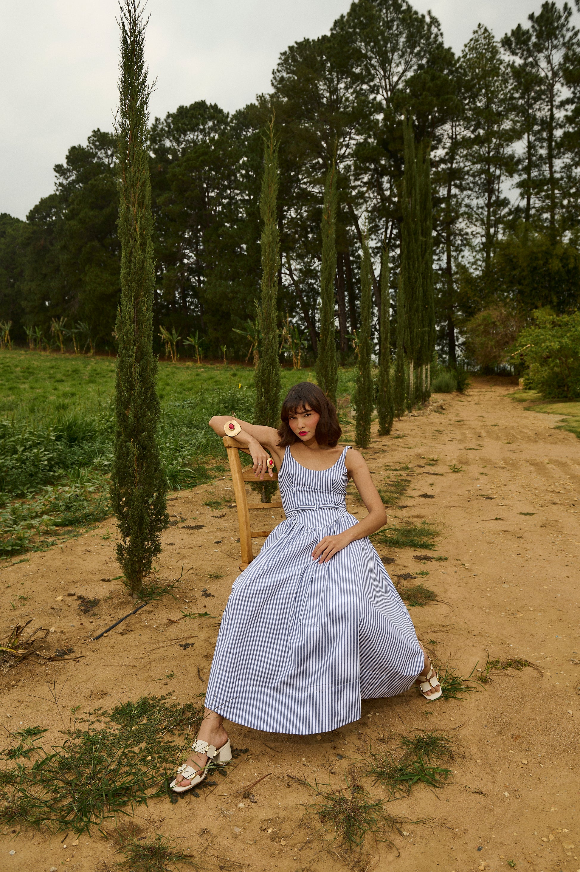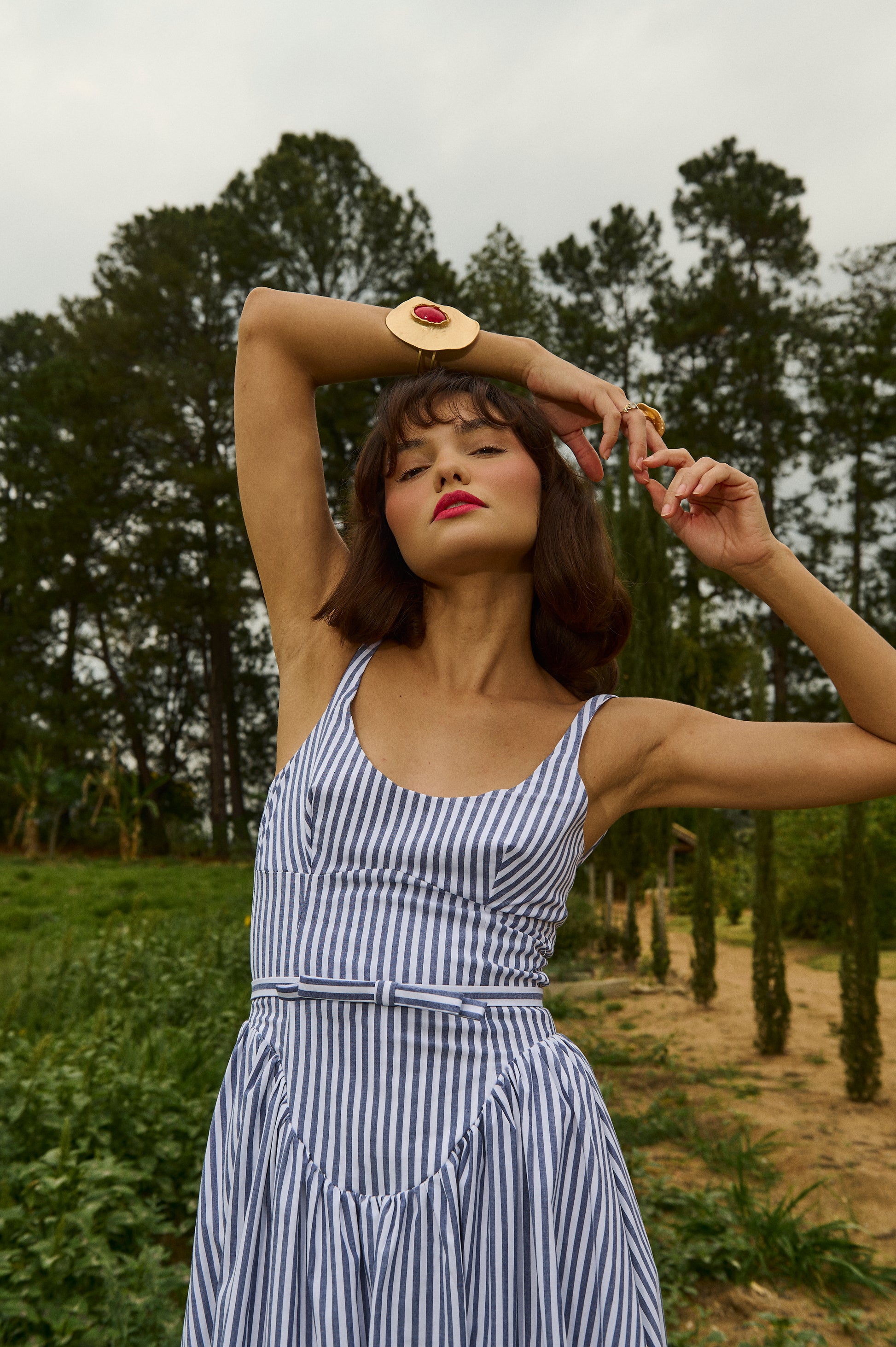 Confeccionado em algodão de listras verticais, o modelo traduz frescor e movimento, unindo leveza e elegância em um desenho que alonga e encanta.