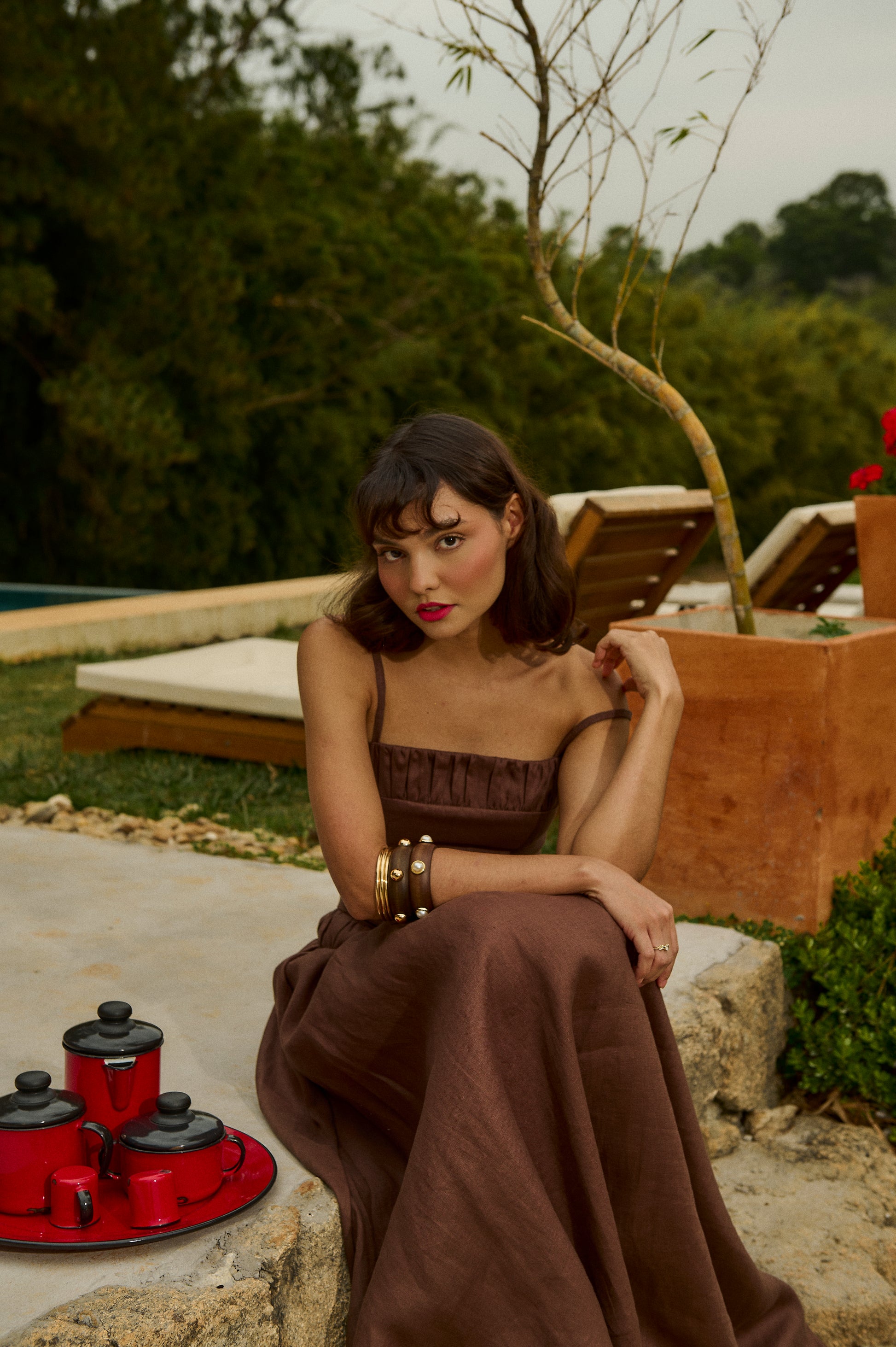 O decote reto e as alças finas equilibram delicadeza e força, enquanto o caimento amplo da saia traduz movimento e sofisticação atemporal.