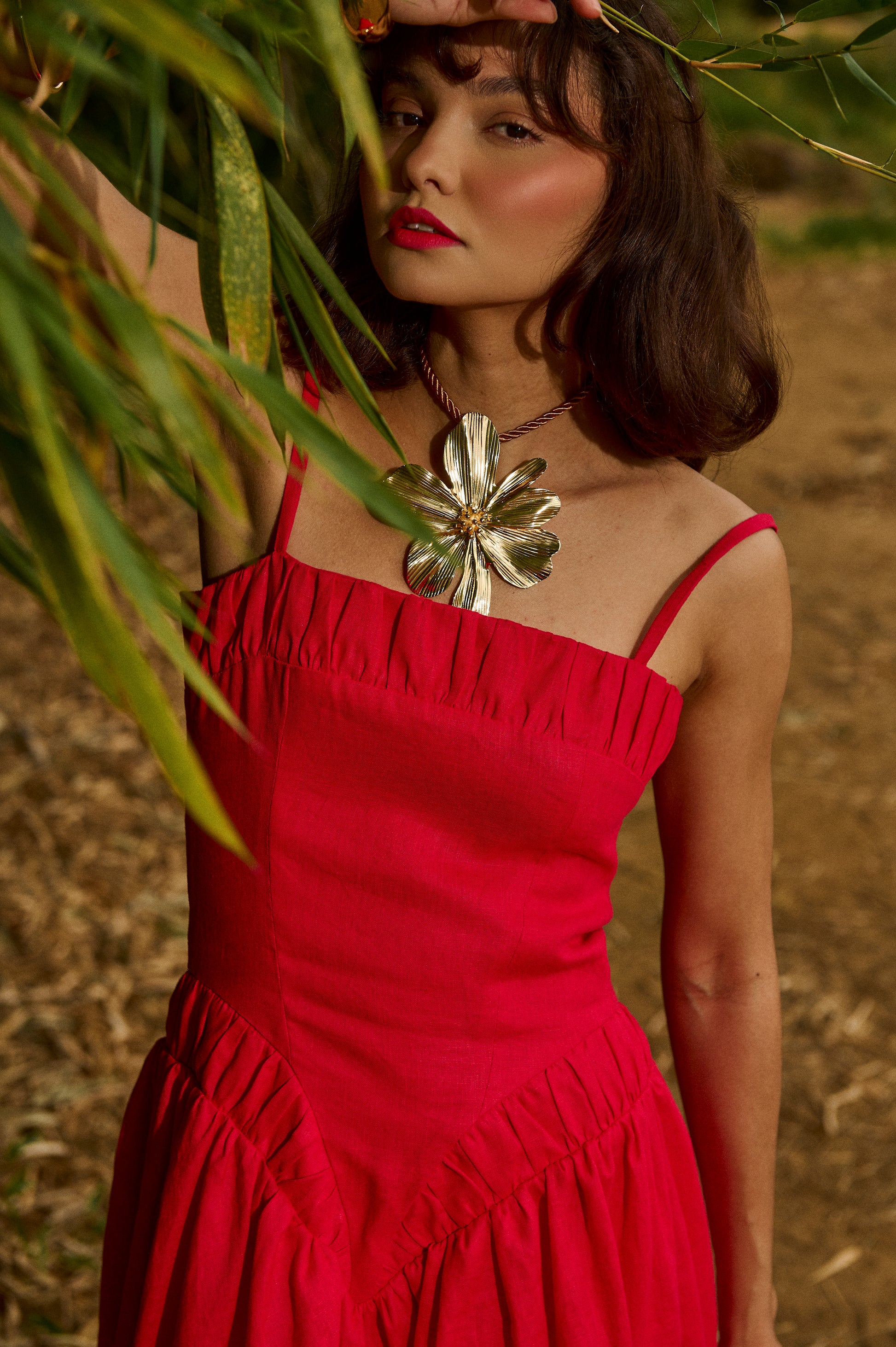 O decote reto e as alças finas equilibram delicadeza e força, enquanto o caimento amplo da saia traduz movimento e sofisticação atemporal.