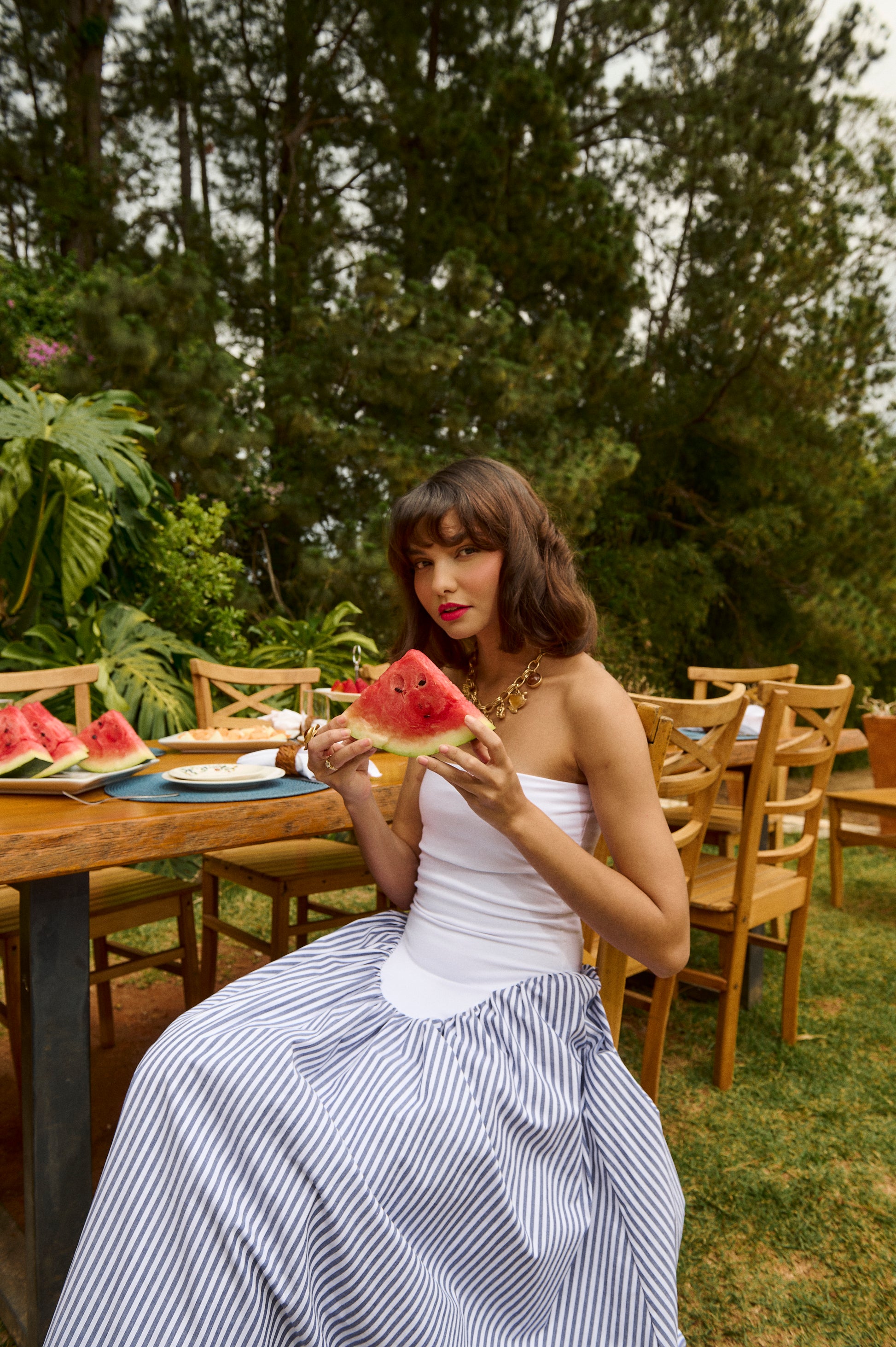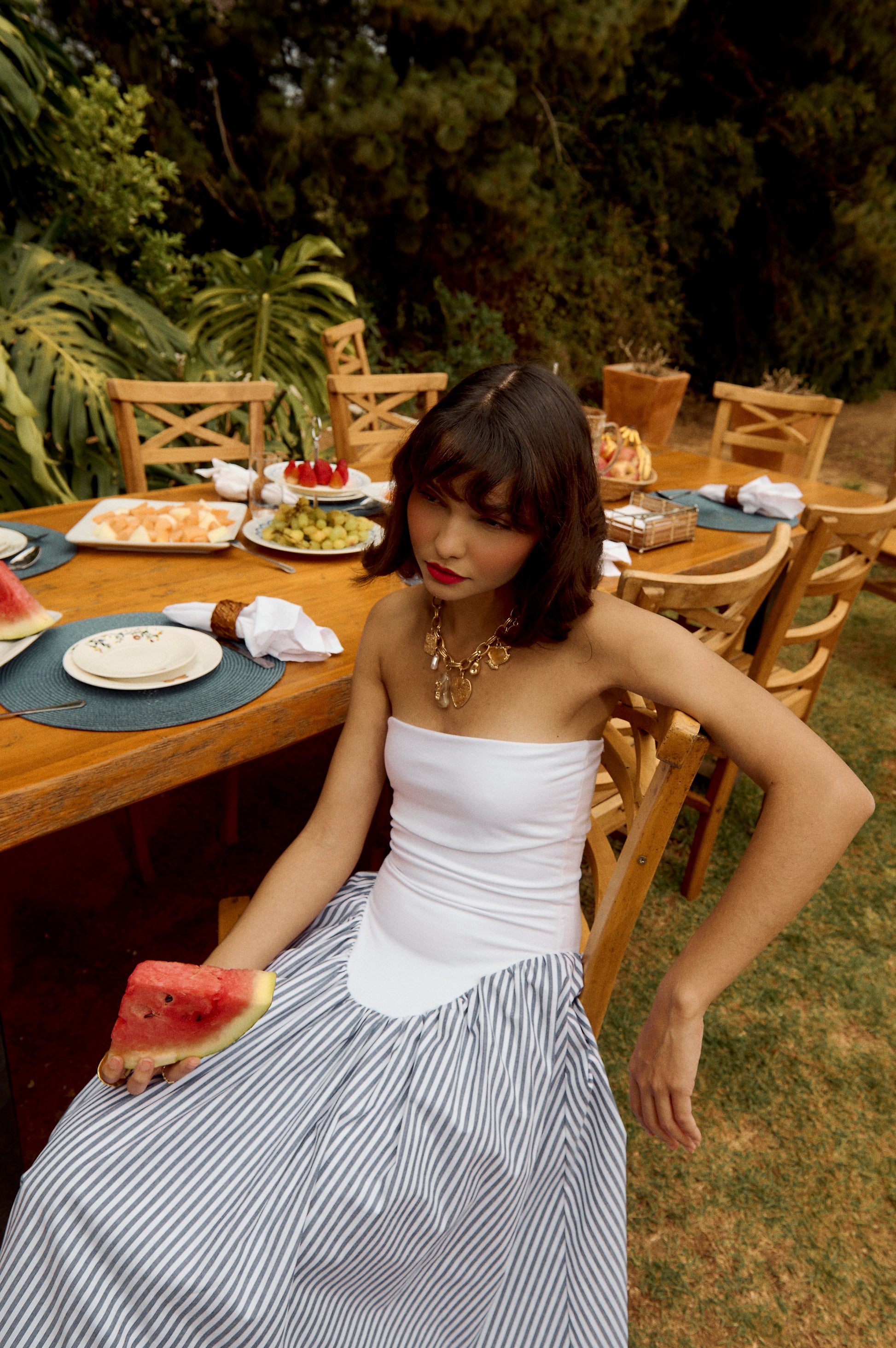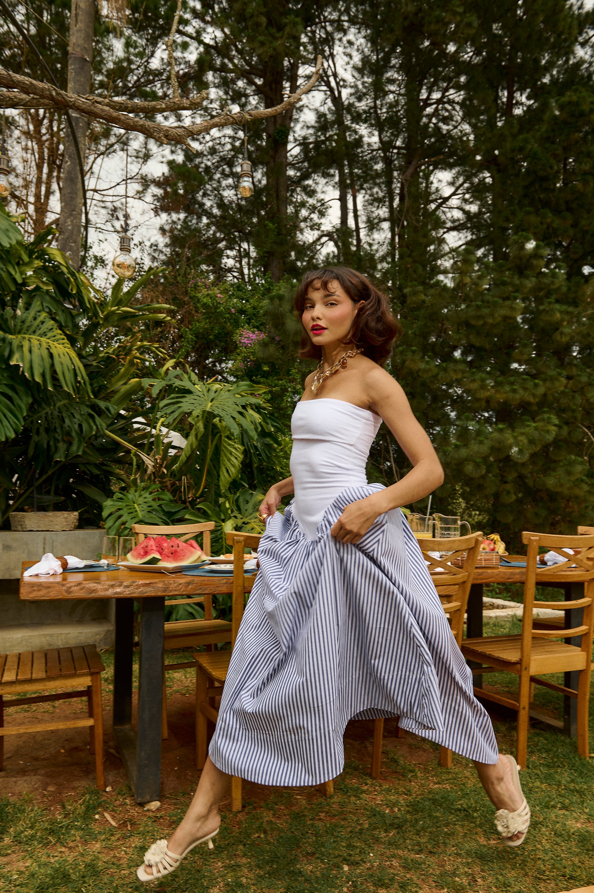Com parte superior em malha ajustável e saia mídi de listras em algodão, a peça cria um contraste sutil entre textura e estrutura. O recorte na cintura destaca a silhueta com naturalidade, enquanto o caimento fluido da saia imprime movimento e frescor.
