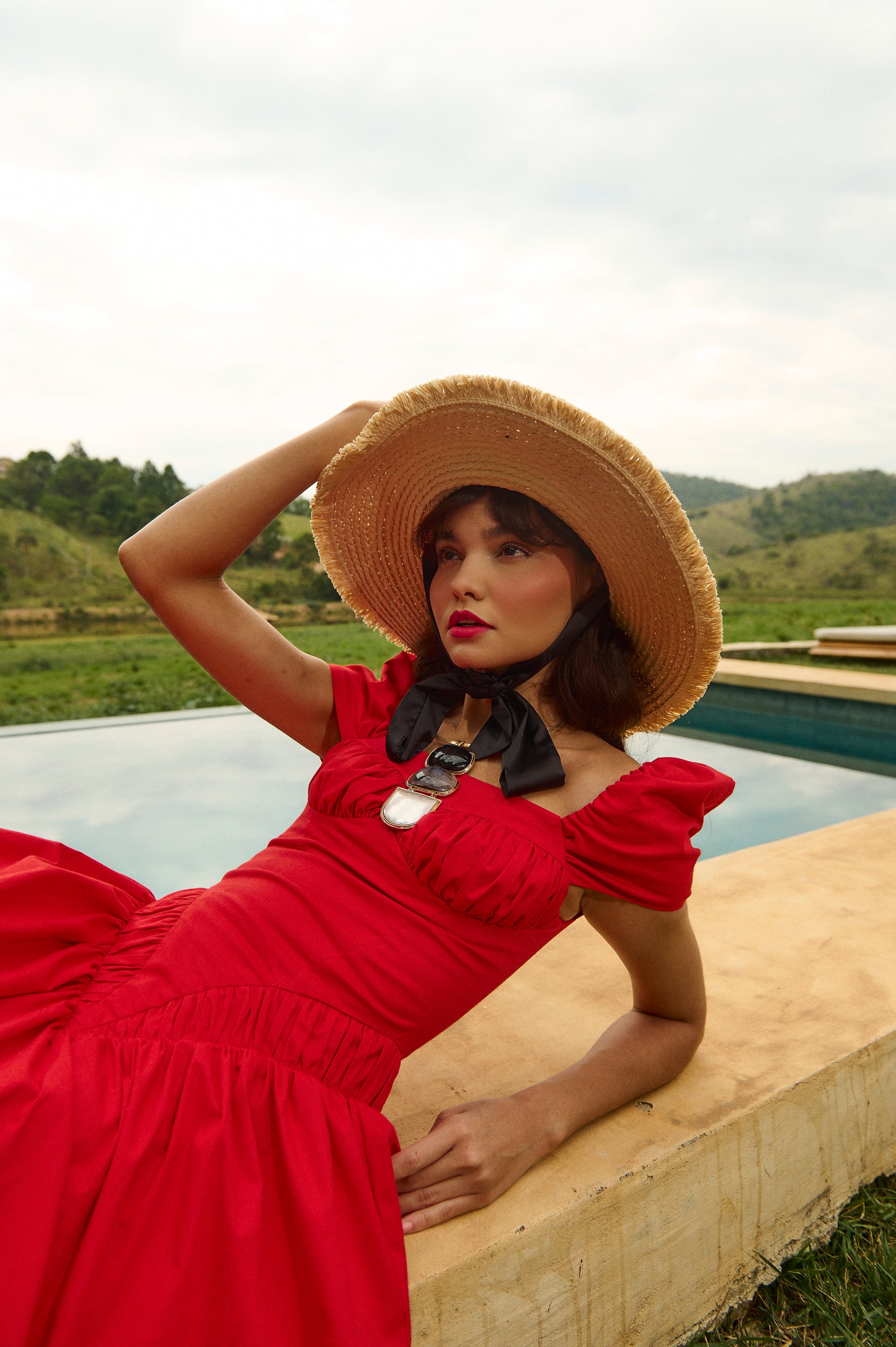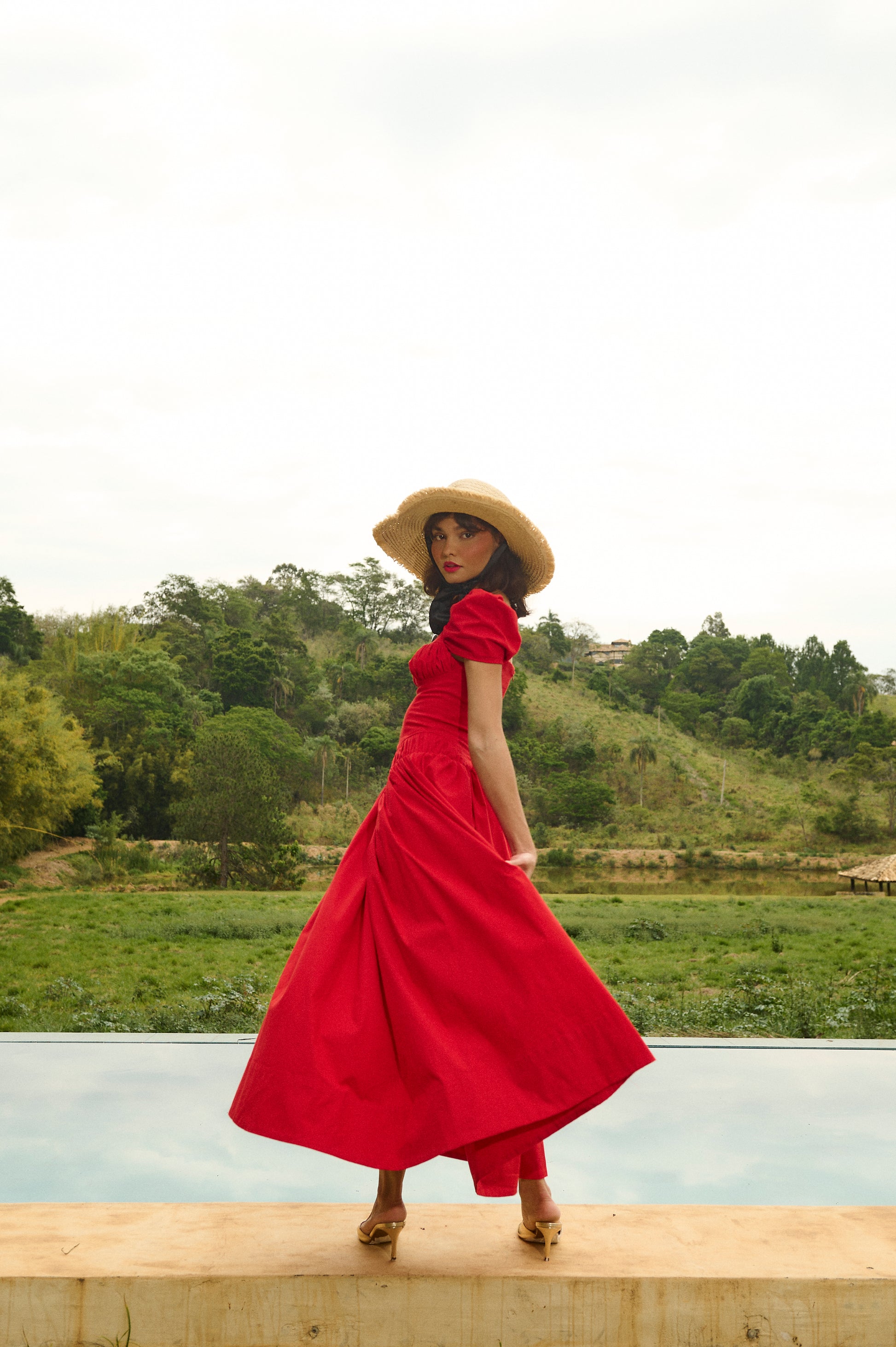 A cintura marcada e a saia ampla equilibram volume e movimento, resultando em uma peça que celebra o design artesanal, a feminilidade e o frescor dos dias leves.